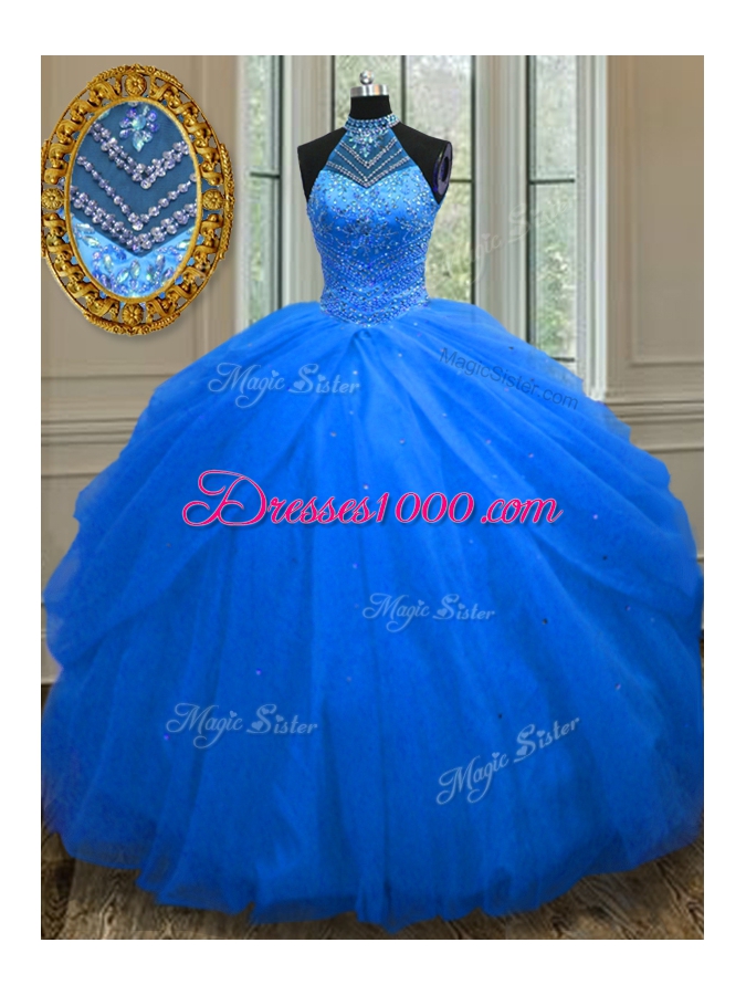 Halter Top Tulle Sleeveless Floor Length 15 Quinceanera Dress and Beading