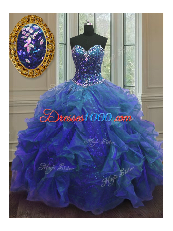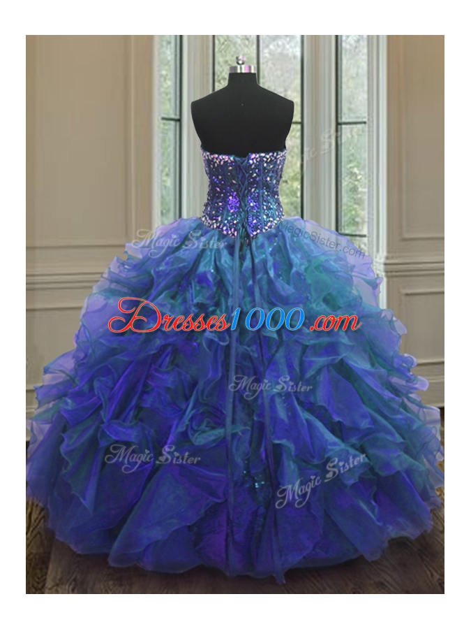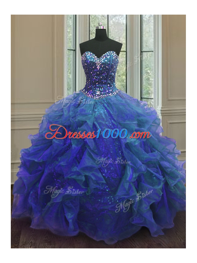Vintage Blue Lace Up Sweetheart Beading and Ruffles Quince Ball Gowns Organza and Sequined Sleeveless