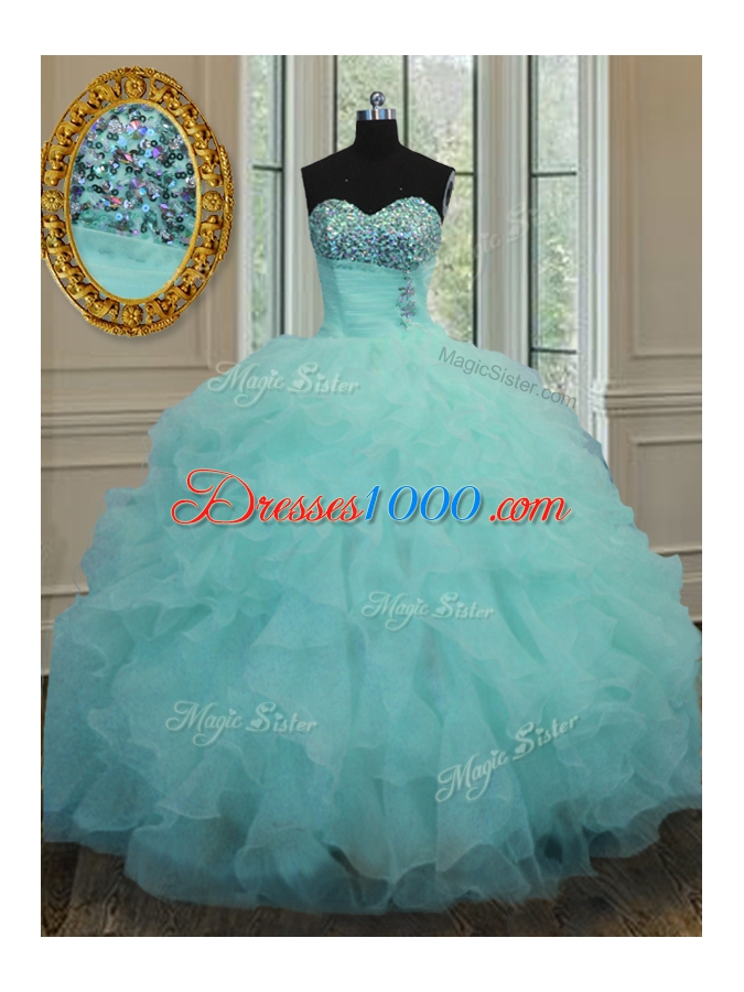 Aqua Blue Ball Gown Prom Dress Military Ball and Sweet 16 and Quinceanera and For with Beading and Ruffles Sweetheart Sleeveless Lace Up