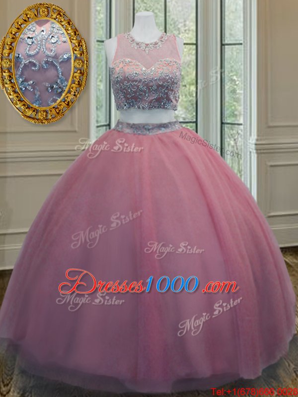 Luxury Ruffled Scoop Sleeveless Zipper 15th Birthday Dress Pink Tulle