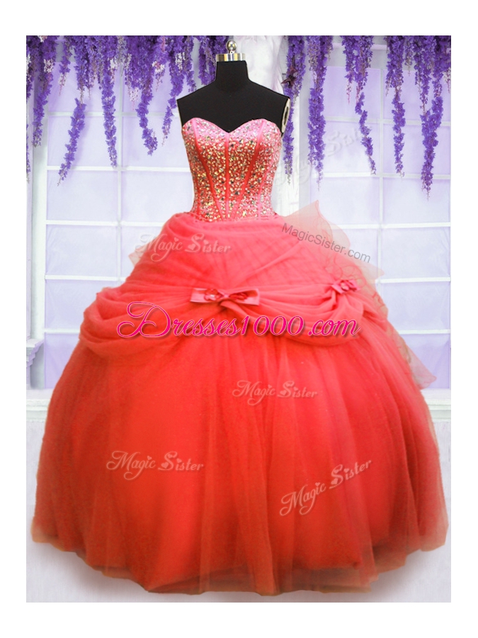 Superior Sweetheart Sleeveless Sweet 16 Dress Floor Length Beading and Bowknot Coral Red Tulle
