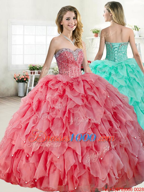 Custom Designed Watermelon Red and Coral Red Sweetheart Neckline Beading 15th Birthday Dress Sleeveless Lace Up