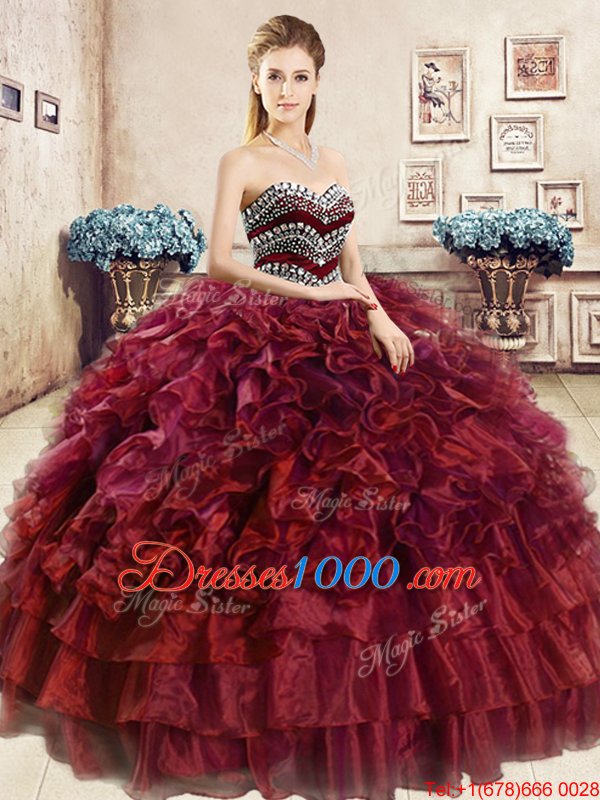 Stunning Wine Red Sleeveless Beading and Ruffles Floor Length 15th Birthday Dress