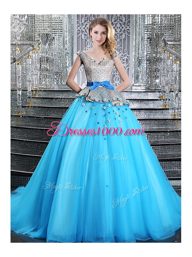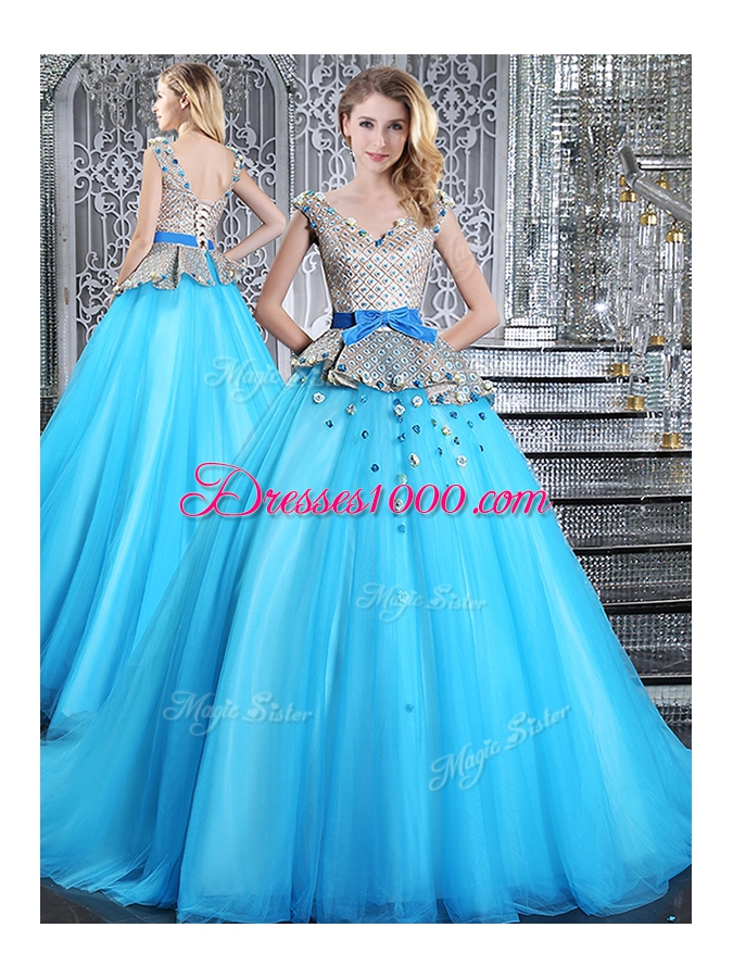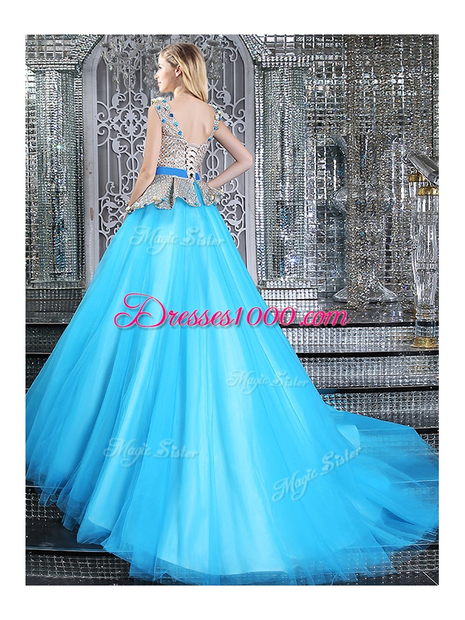 Baby Blue Ball Gowns V-neck Sleeveless Tulle Brush Train Lace Up Appliques and Belt 15 Quinceanera Dress
