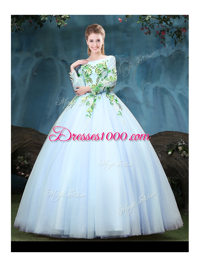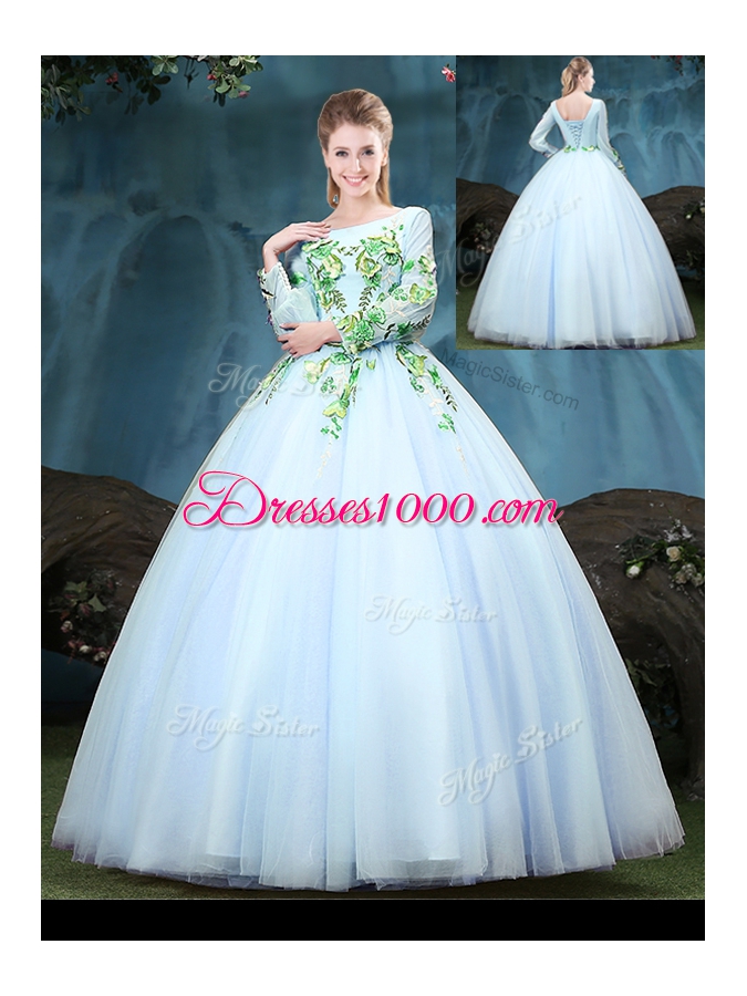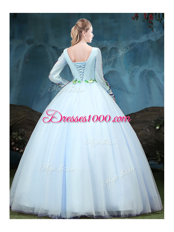Scoop Long Sleeves Lace Up Vestidos de Quinceanera Light Blue Tulle