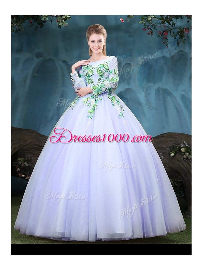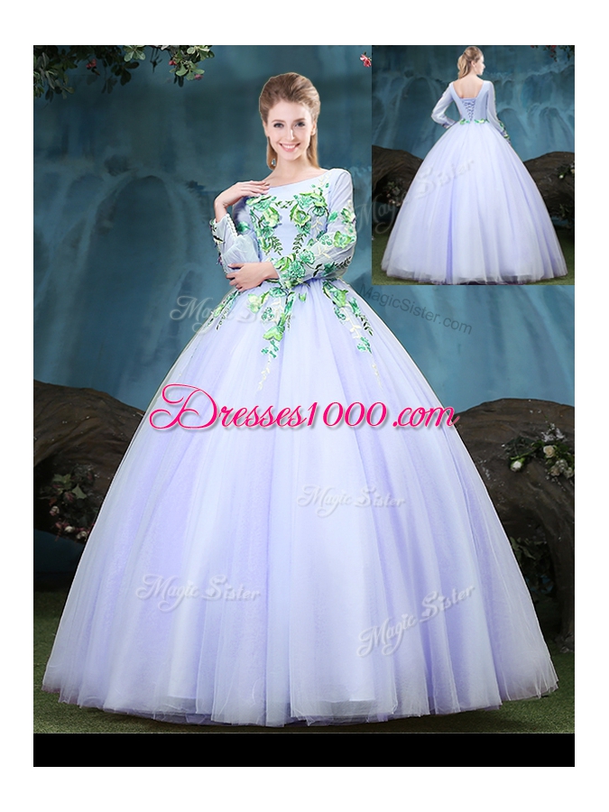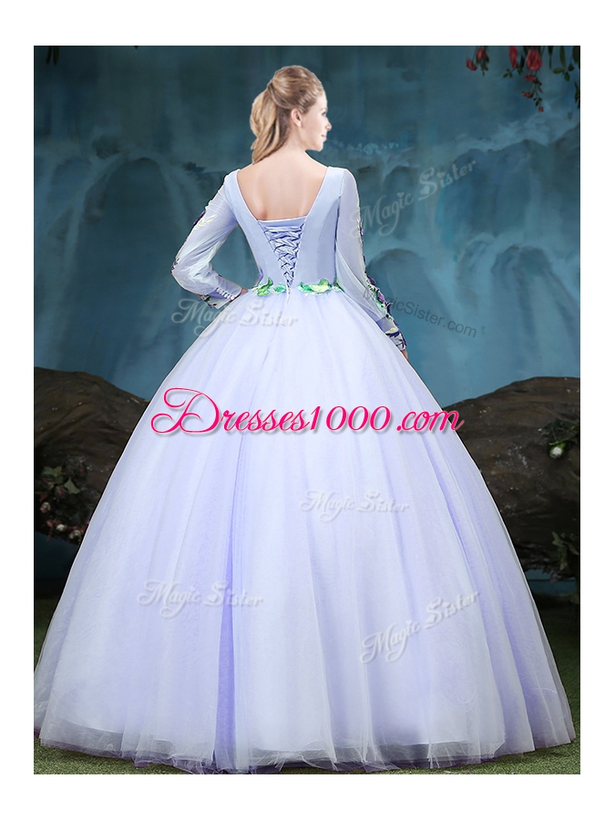 Wonderful Scoop Lavender Lace Up Sweet 16 Dresses Appliques Long Sleeves Floor Length