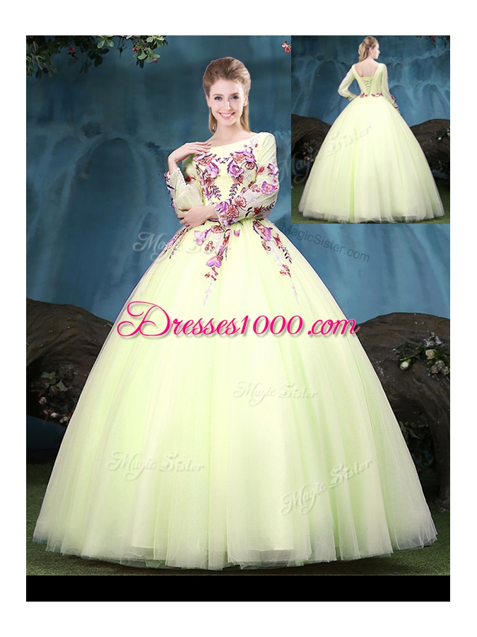Scoop Floor Length Ball Gowns Long Sleeves Yellow Green Quinceanera Dresses Lace Up