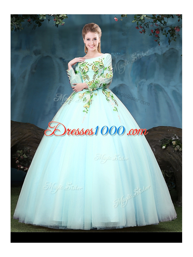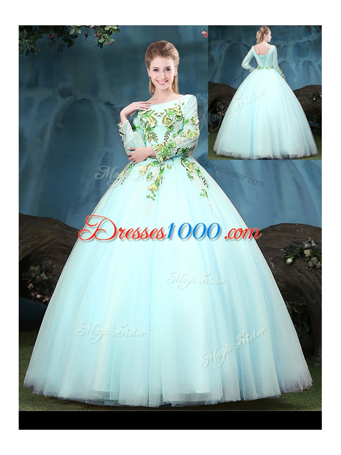 New Style Scoop Aqua Blue Tulle Lace Up Sweet 16 Quinceanera Dress Long Sleeves Floor Length Appliques