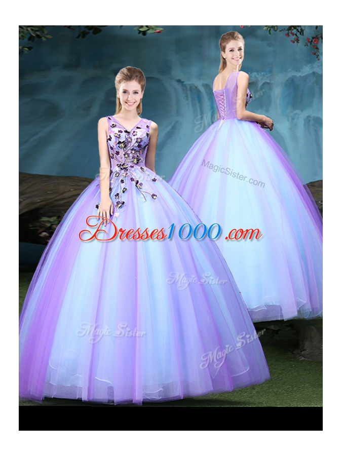 Custom Designed V-neck Sleeveless Tulle Ball Gown Prom Dress Appliques Lace Up