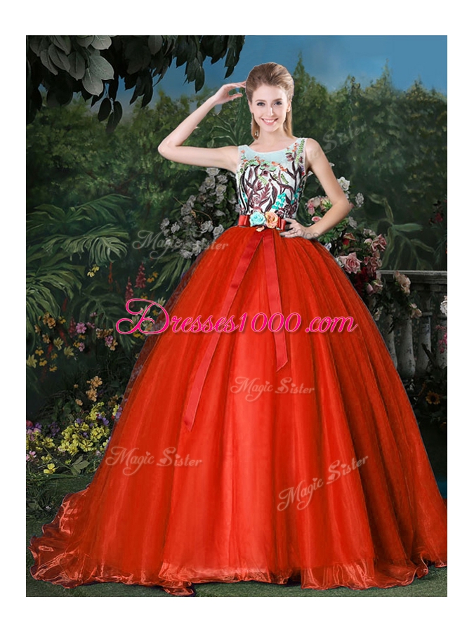 Dynamic Red Scoop Zipper Appliques and Belt Vestidos de Quinceanera Brush Train Sleeveless