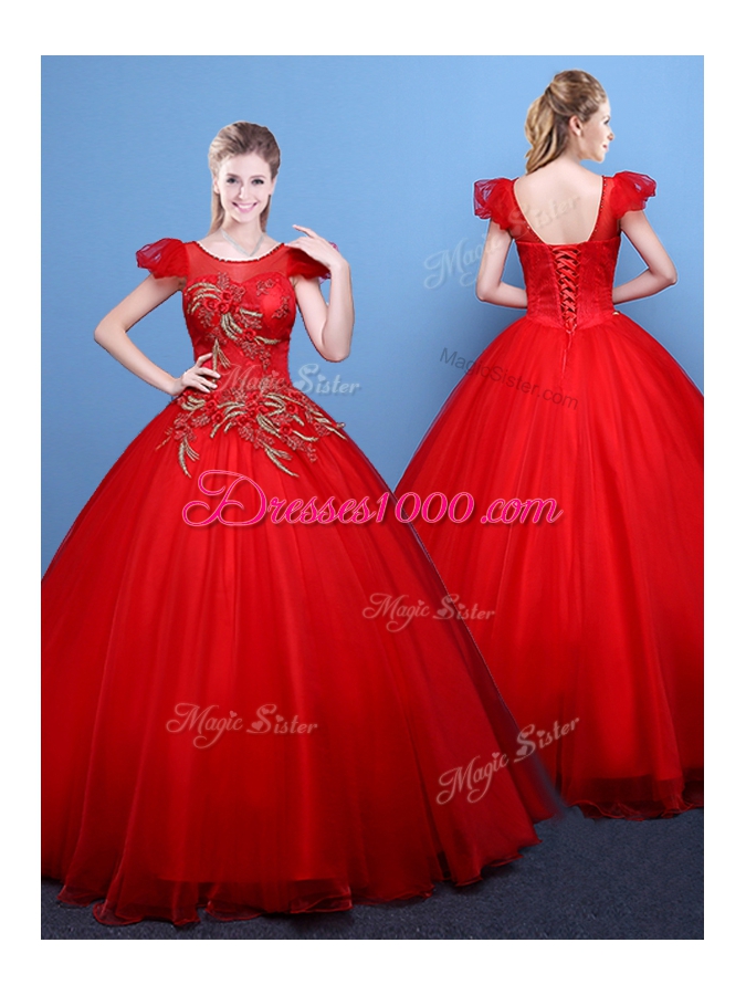 Scoop Short Sleeves Lace Up Vestidos de Quinceanera Red Tulle