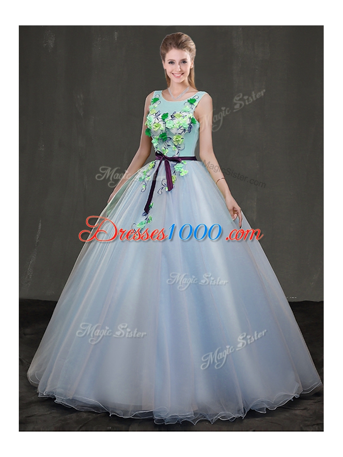 Scoop Sleeveless Floor Length Appliques Lace Up Sweet 16 Dress with Light Blue