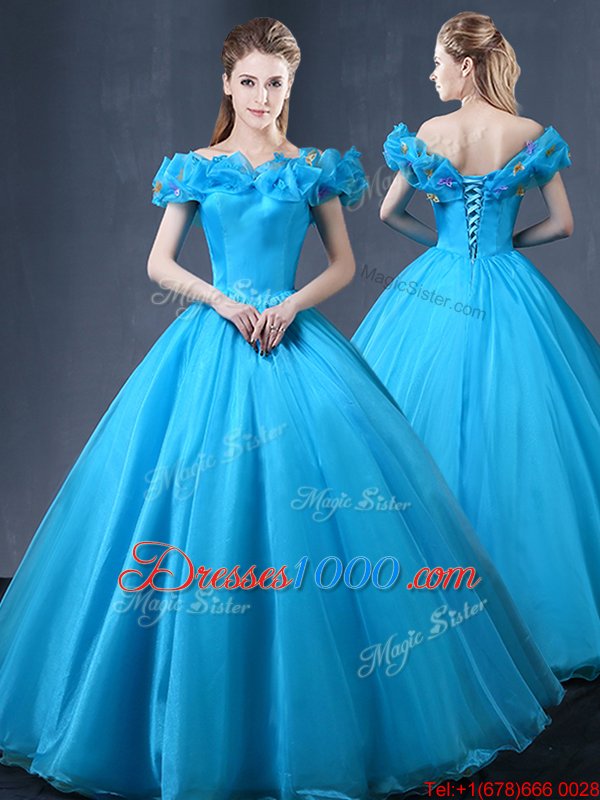 Artistic Off the Shoulder Baby Blue Cap Sleeves Floor Length Appliques Lace Up Sweet 16 Dress