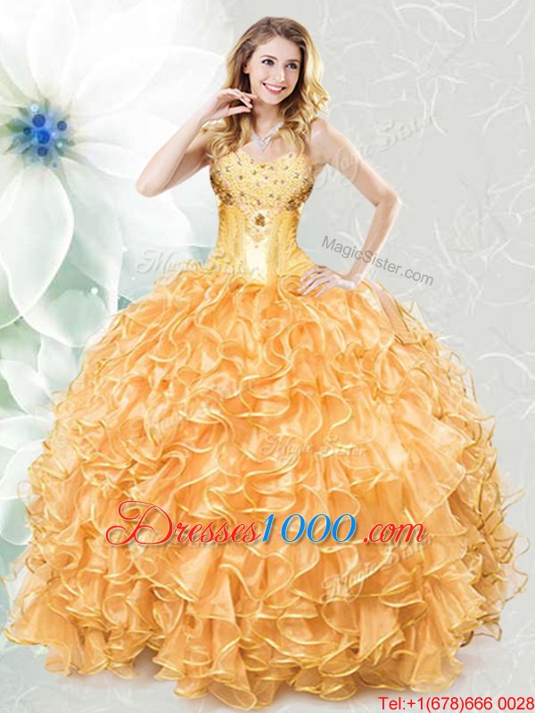 Eye-catching Gold Sweetheart Neckline Beading and Ruffles Quinceanera Dresses Sleeveless Lace Up