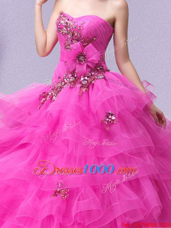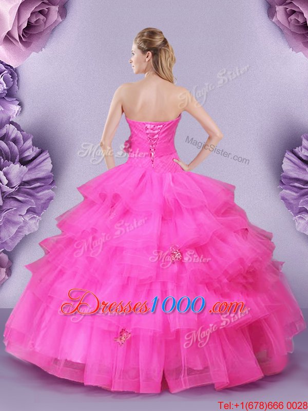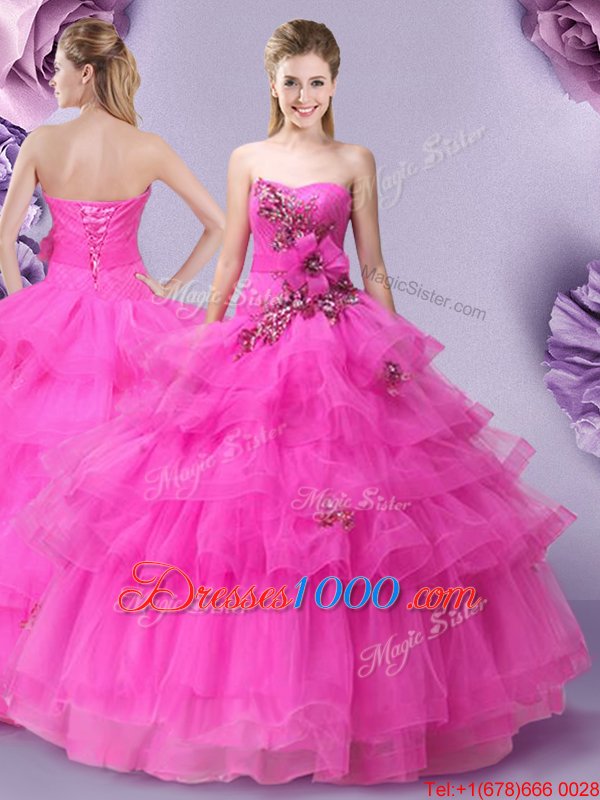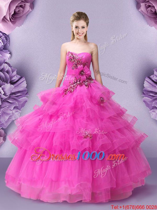 Suitable Hot Pink Lace Up 15th Birthday Dress Appliques and Ruffled Layers and Hand Made Flower Sleeveless Floor Length
