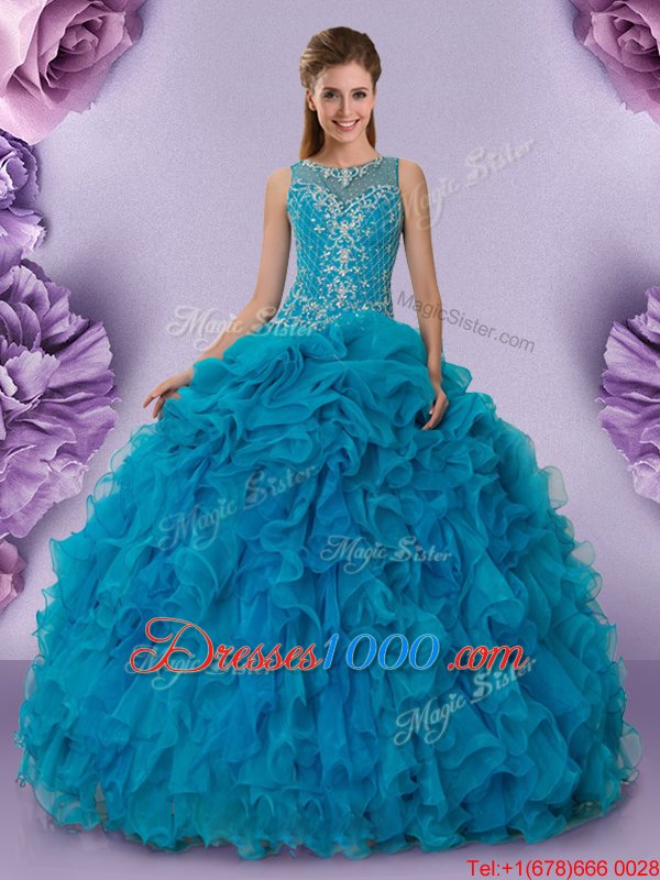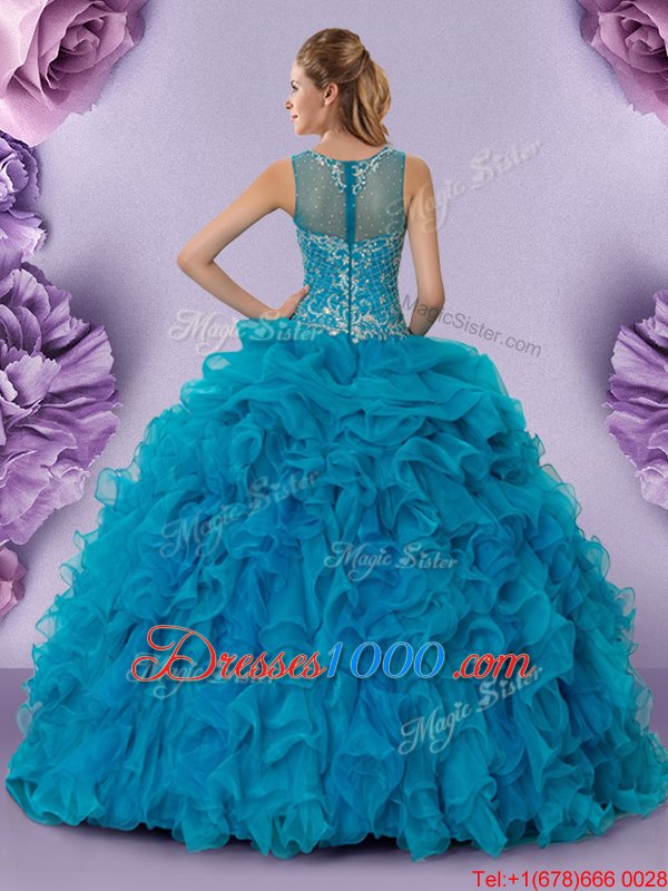 Enchanting Teal Zipper Scoop Beading and Ruffles 15 Quinceanera Dress Organza Sleeveless
