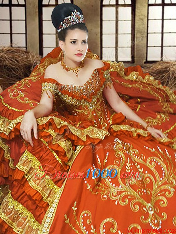 Sweet Off The Shoulder Sleeveless Satin Ball Gown Prom Dress Embroidery Lace Up