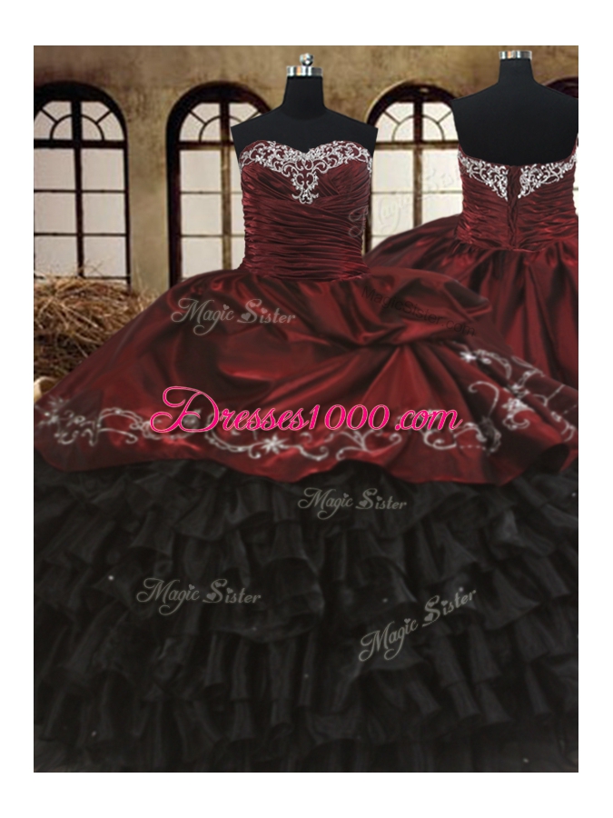 Clearance Red And Black Ball Gown Prom Dress Military Ball and Sweet 16 and Quinceanera and For with Beading and Embroidery and Ruffled Layers Sweetheart Sleeveless Lace Up