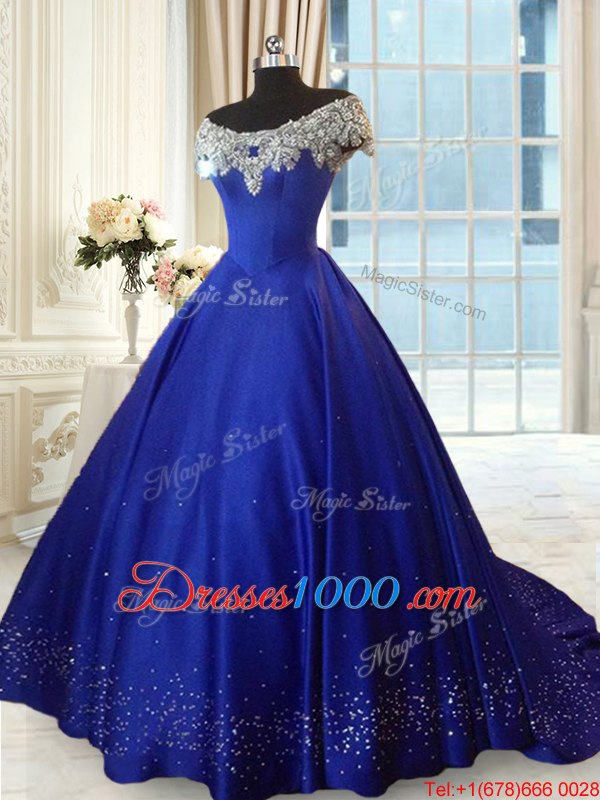 Off The Shoulder Cap Sleeves Satin Quince Ball Gowns Beading and Lace Lace Up
