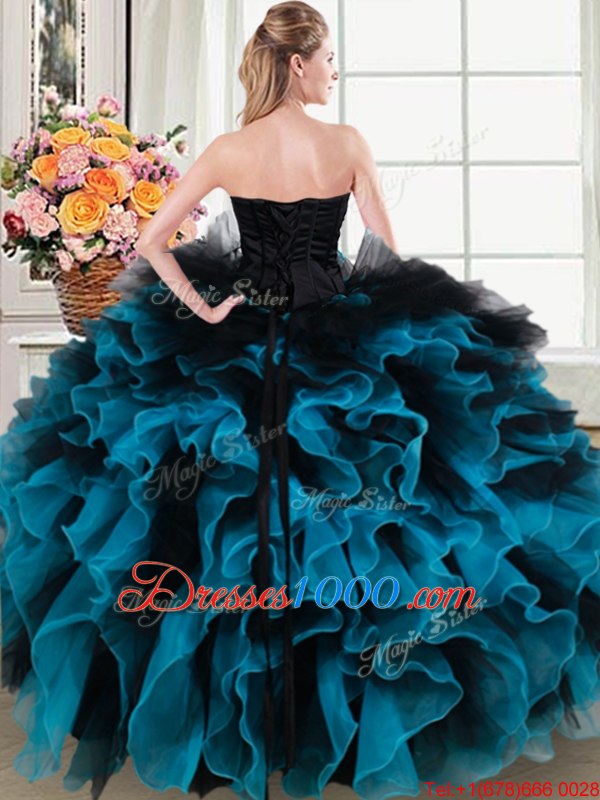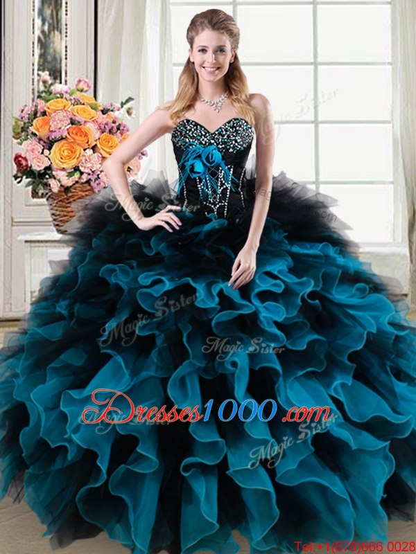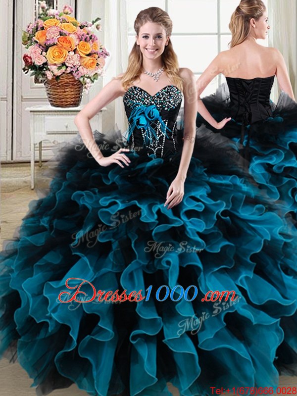 Luxury Sweetheart Sleeveless Organza and Tulle Quince Ball Gowns Beading and Ruffles and Hand Made Flower Lace Up