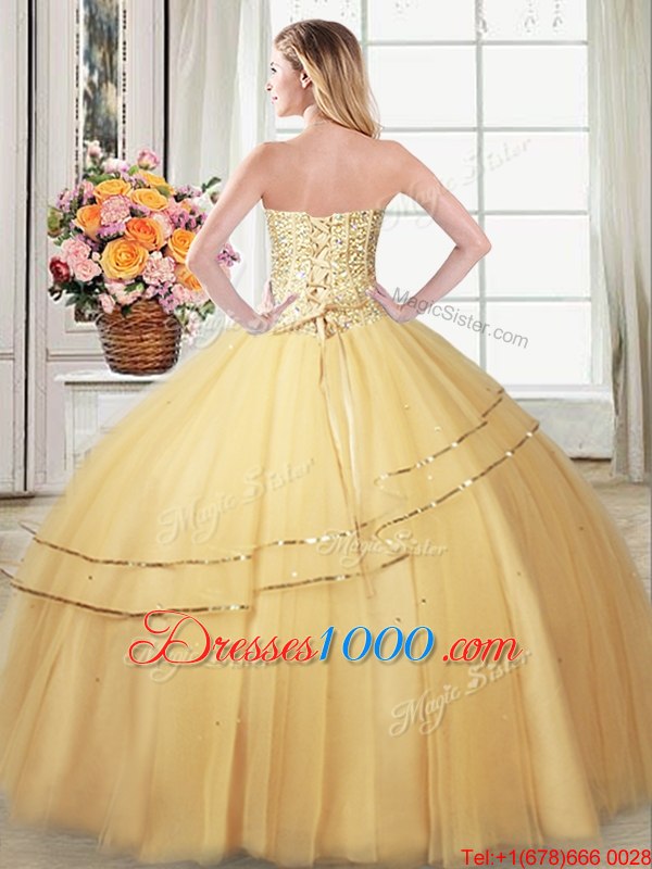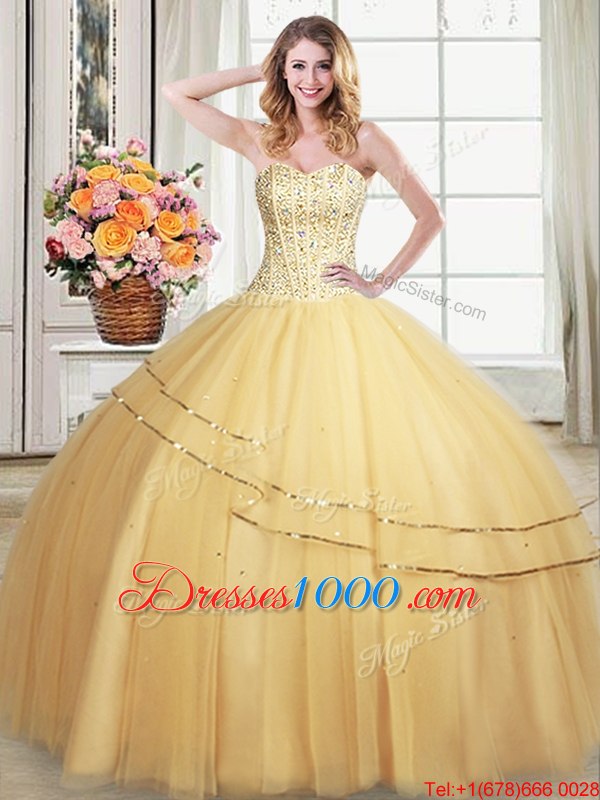 Gold Ball Gowns Sweetheart Sleeveless Tulle Floor Length Lace Up Beading and Sequins Quince Ball Gowns