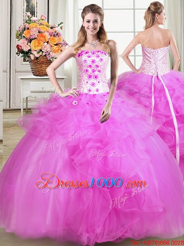 Floor Length Fuchsia Vestidos de Quinceanera Tulle Sleeveless Beading and Appliques and Embroidery