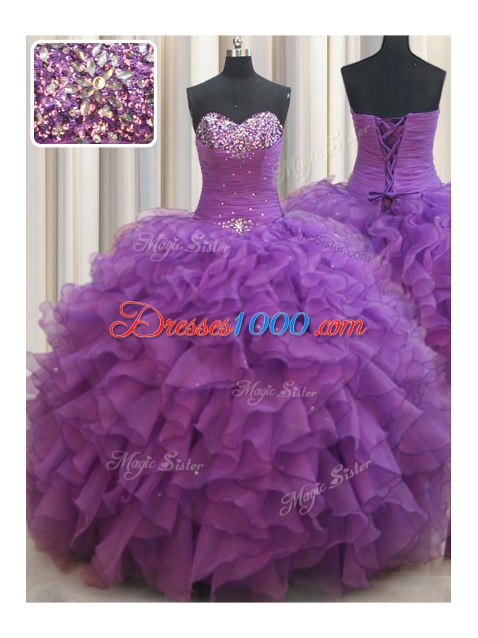 Eggplant Purple Lace Up Sweetheart Beading and Ruffles Sweet 16 Dress Organza Sleeveless