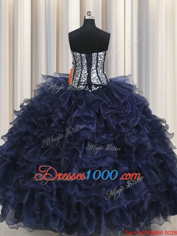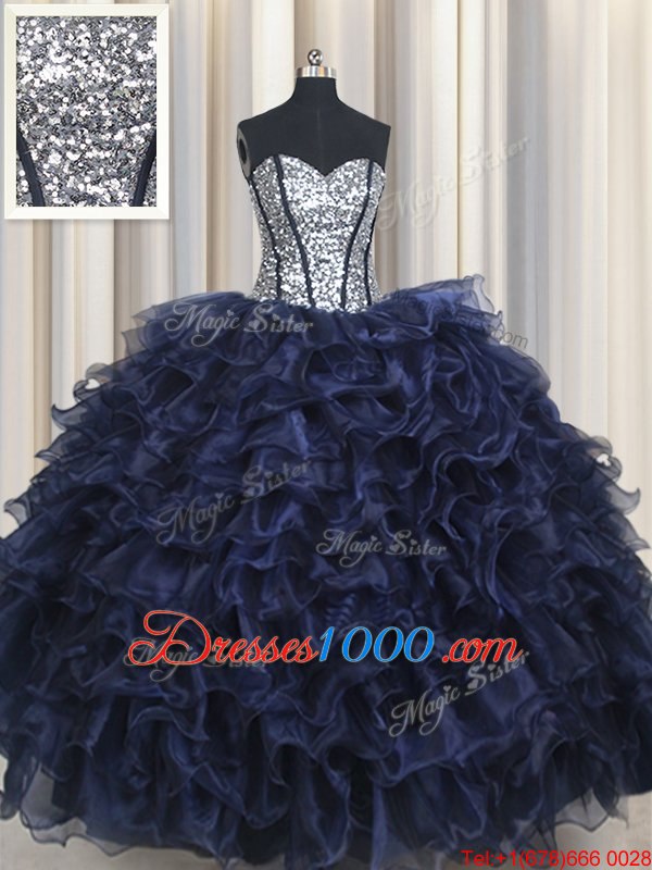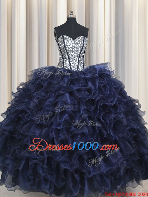 Sophisticated Sequins Ruffled Ball Gowns Quince Ball Gowns Navy Blue Sweetheart Organza Sleeveless Floor Length Lace Up