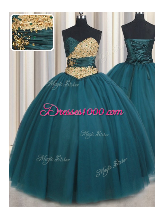 Floor Length Lace Up Quinceanera Dresses Teal and In for Military Ball and Sweet 16 and Quinceanera with Beading