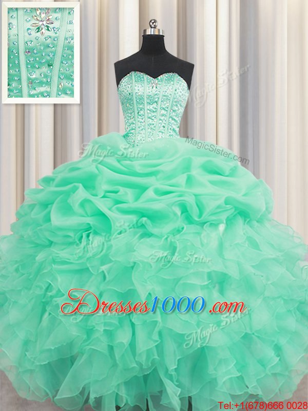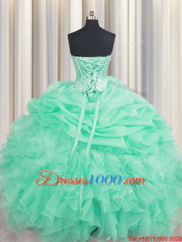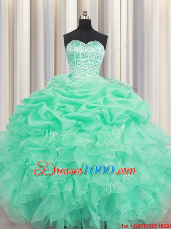 Extravagant Sweetheart Sleeveless Sweet 16 Dresses Floor Length Beading and Ruffles and Pick Ups Apple Green Organza