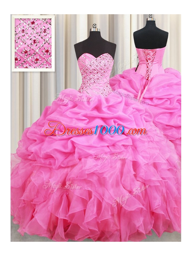 Popular Rose Pink Quinceanera Gown Military Ball and Sweet 16 and Quinceanera and For with Beading and Ruffles and Pick Ups Sweetheart Sleeveless Lace Up