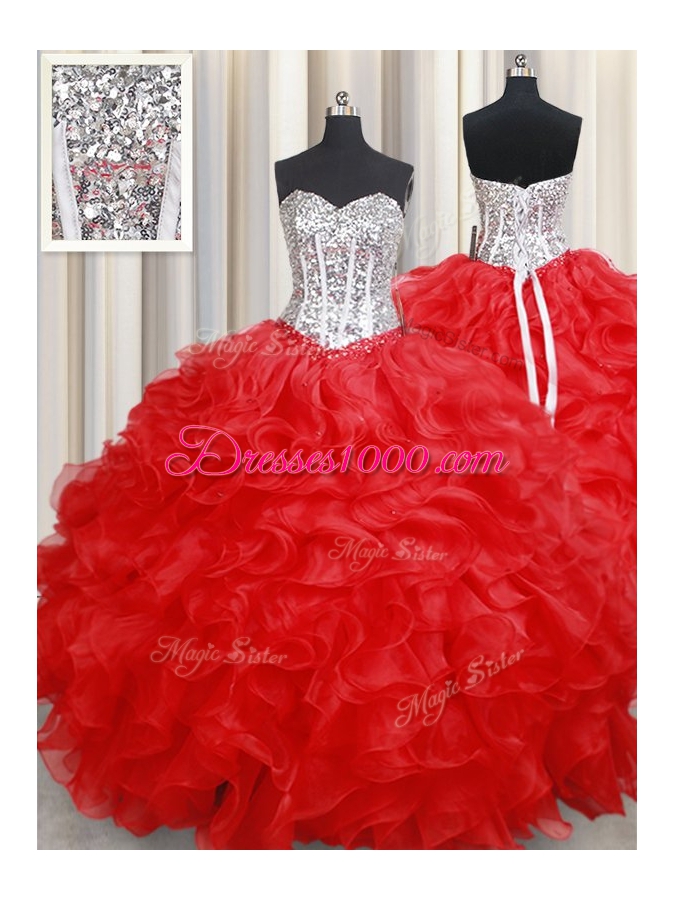 Red Lace Up Sweetheart Beading and Ruffles Ball Gown Prom Dress Organza Sleeveless