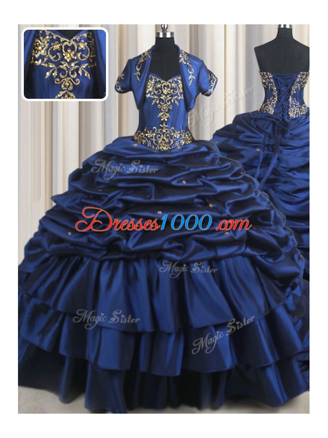 Flare With Train Navy Blue Vestidos de Quinceanera Taffeta Court Train Sleeveless Embroidery and Pick Ups