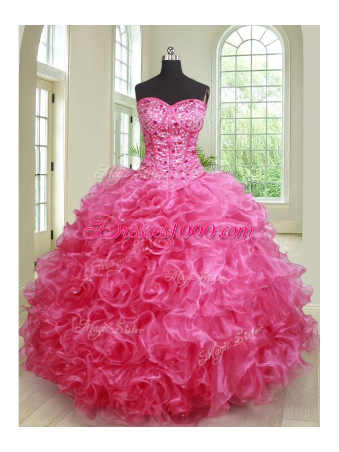 Ideal Hot Pink Sleeveless Beading and Ruffles Floor Length Quinceanera Dresses