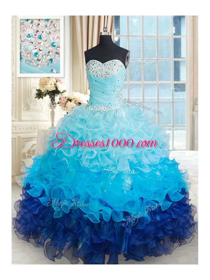Custom Design Sweetheart Sleeveless 15 Quinceanera Dress Floor Length Beading and Ruffles Multi-color Organza