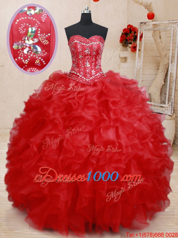 Pretty Floor Length Lace Up Sweet 16 Dress Red and In for Military Ball and Sweet 16 and Quinceanera with Beading and Ruffles
