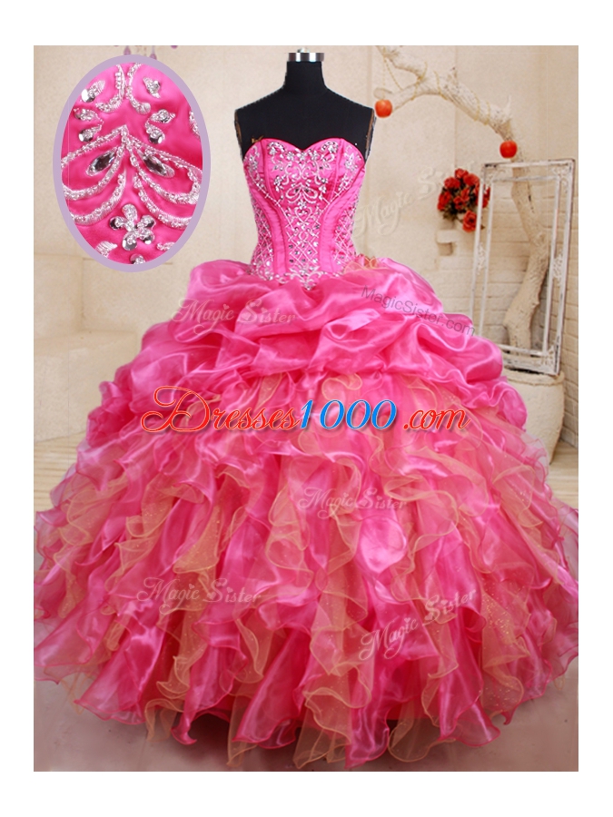 Sweet Hot Pink Ball Gowns Sweetheart Sleeveless Organza Floor Length Lace Up Beading and Ruffles and Pick Ups Quince Ball Gowns