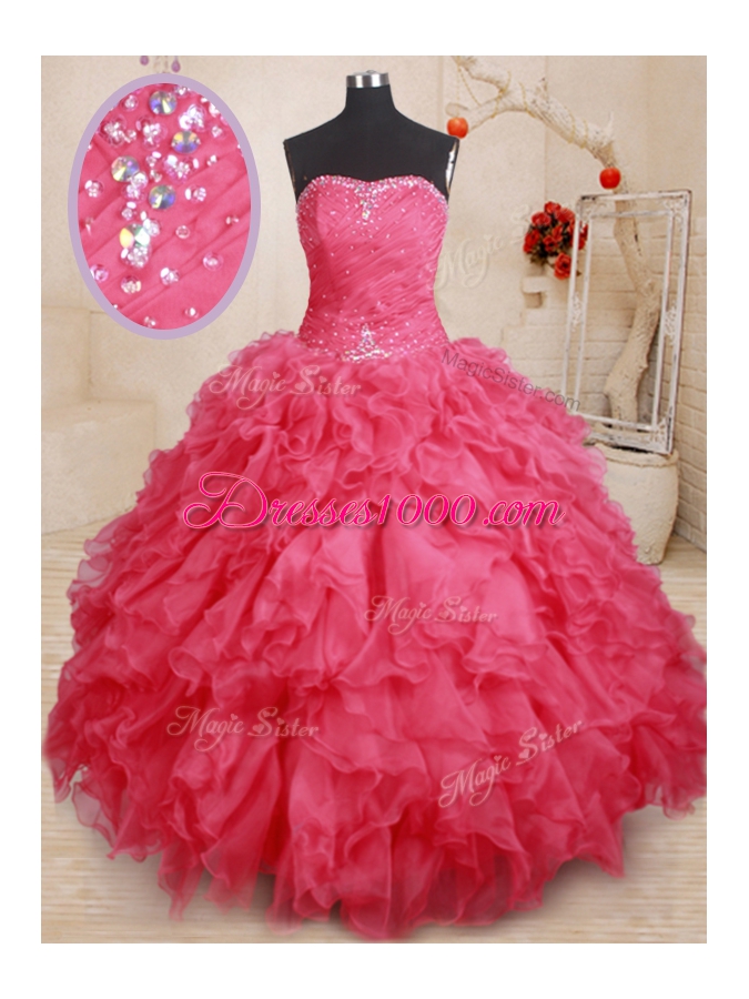New Arrival Coral Red Organza Lace Up Vestidos de Quinceanera Sleeveless Floor Length Beading and Ruffles
