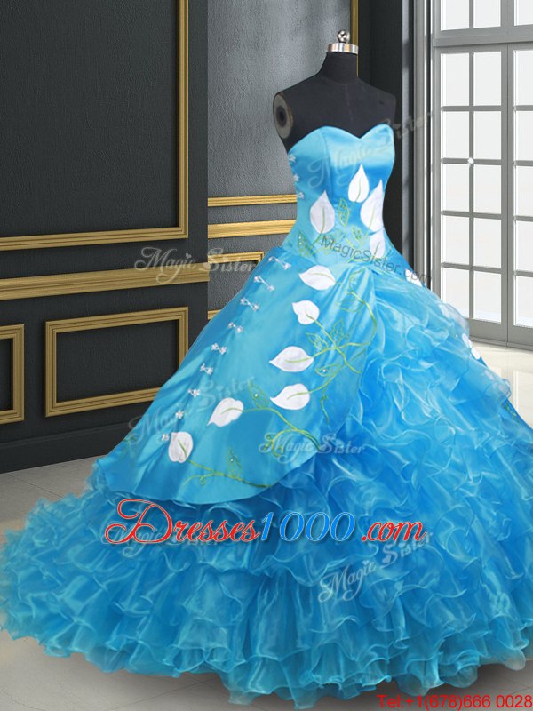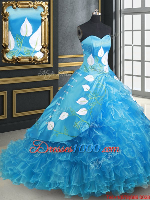 Glorious Sleeveless With Train Embroidery and Ruffled Layers Lace Up Quinceanera Dress with Baby Blue Brush Train