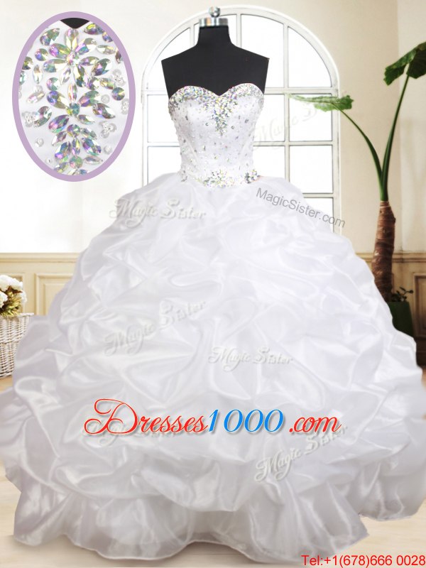 White Ball Gowns Organza Sweetheart Sleeveless Beading and Pick Ups Floor Length Lace Up 15th Birthday Dress