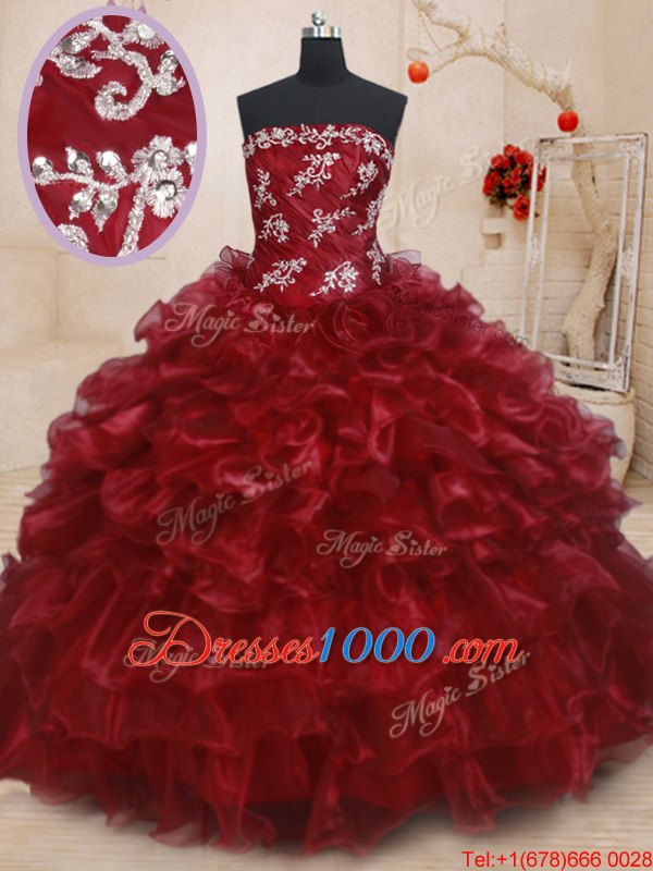 Ruffled Burgundy Sleeveless Organza Lace Up Quinceanera Gown for Military Ball and Sweet 16 and Quinceanera