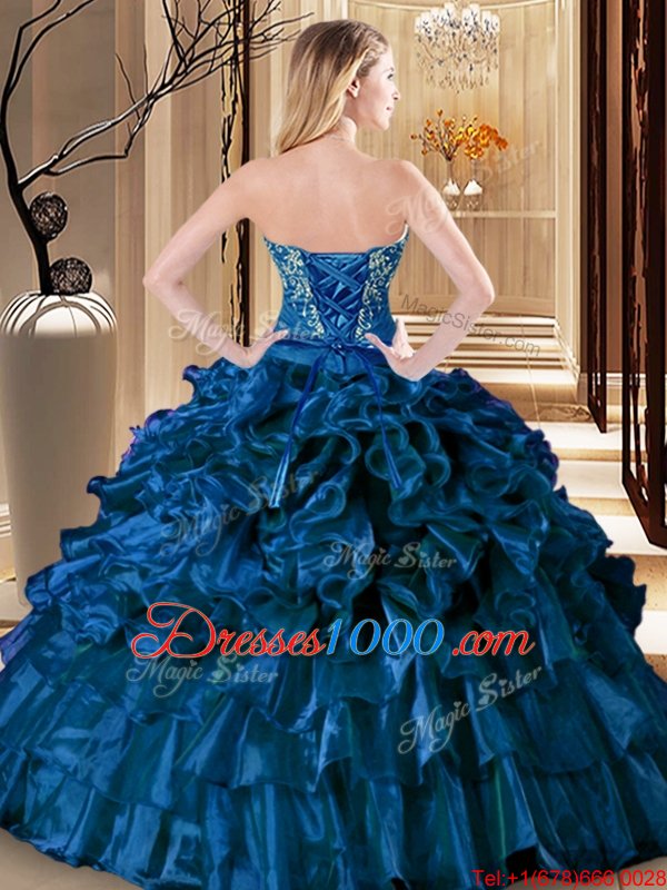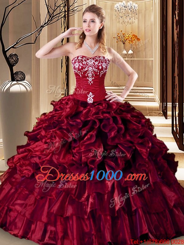Best Wine Red Ball Gowns Sweetheart Sleeveless Organza Floor Length Lace Up Embroidery and Ruffles 15 Quinceanera Dress