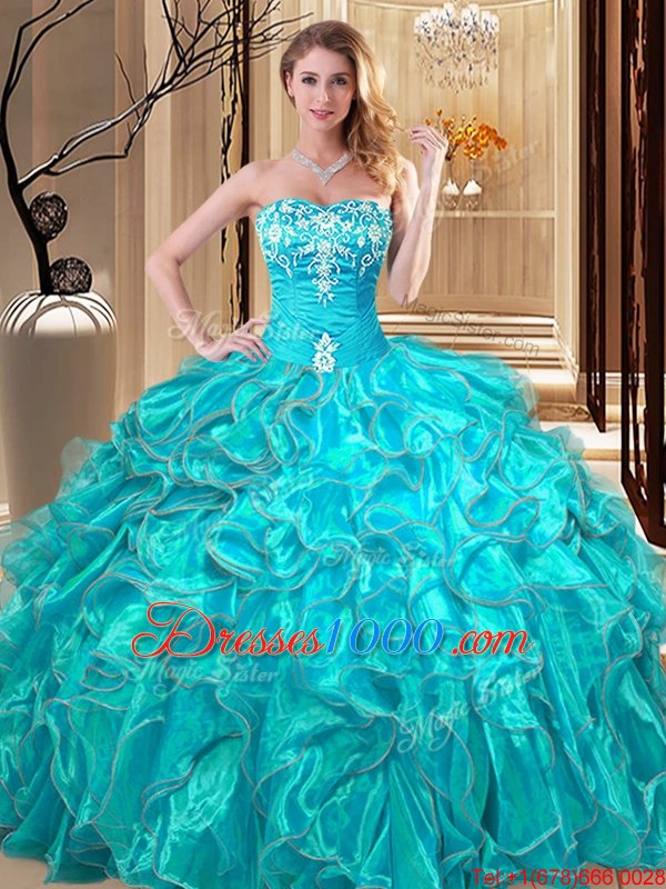 Fancy Aqua Blue Lace Up Sweetheart Embroidery and Ruffles Quinceanera Gown Organza Sleeveless