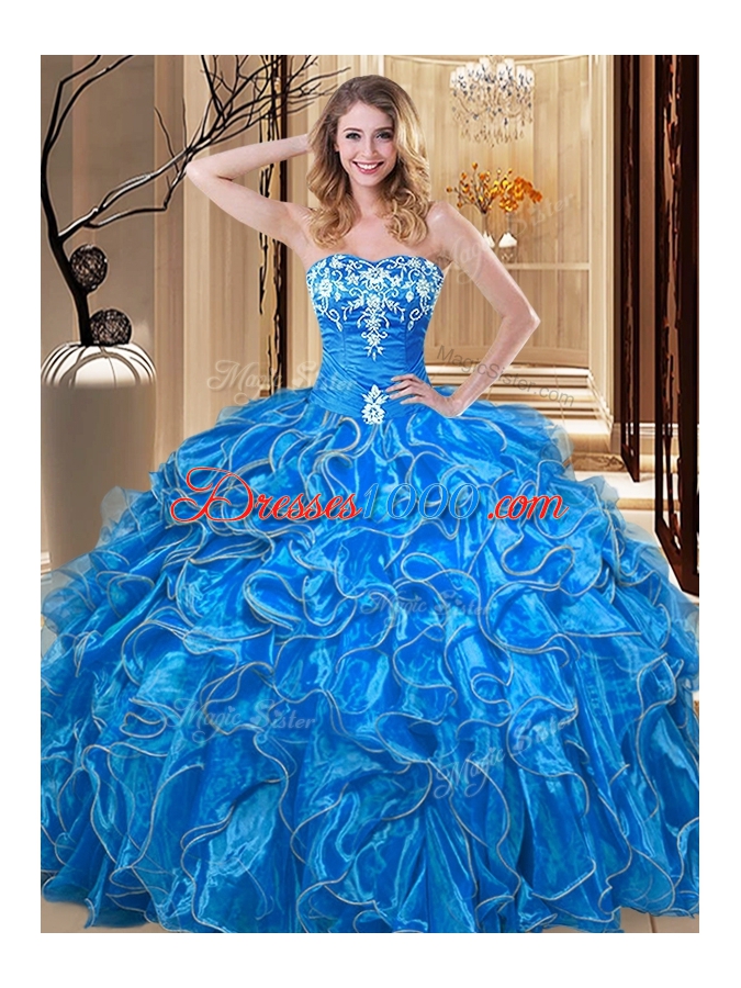 Fabulous Blue Ball Gowns Sweetheart Sleeveless Organza Floor Length Lace Up Embroidery and Ruffles Quinceanera Gown