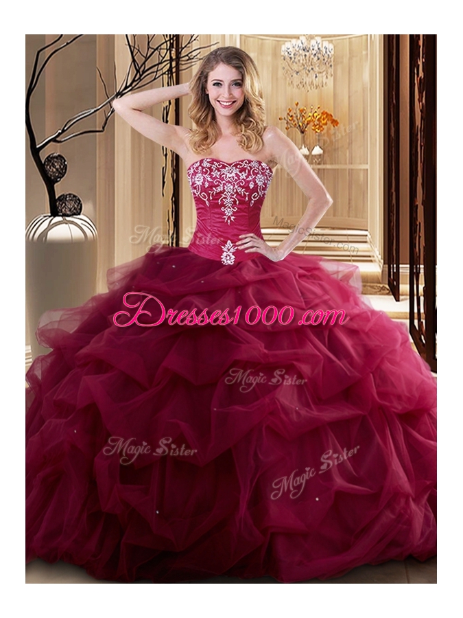 Wine Red Ball Gowns Embroidery and Ruffles Quinceanera Dresses Lace Up Tulle Sleeveless Floor Length
