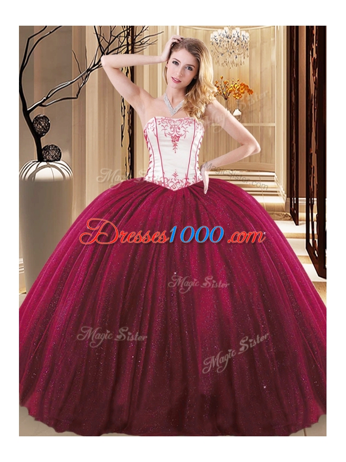 Wine Red Sleeveless Floor Length Embroidery Lace Up Quinceanera Dress
