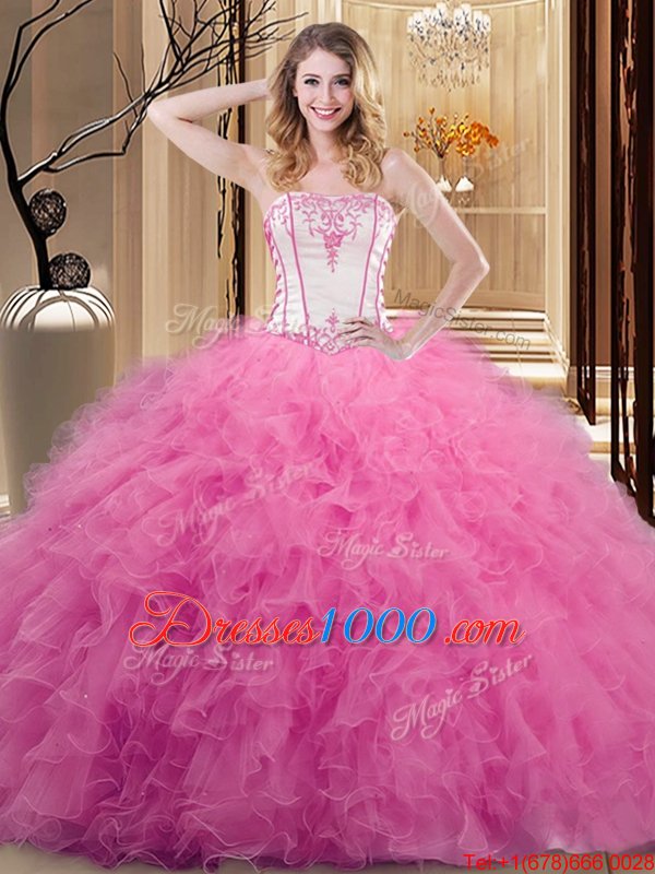On Sale Rose Pink Ball Gowns Strapless Sleeveless Tulle Floor Length Lace Up Embroidery Quinceanera Dress