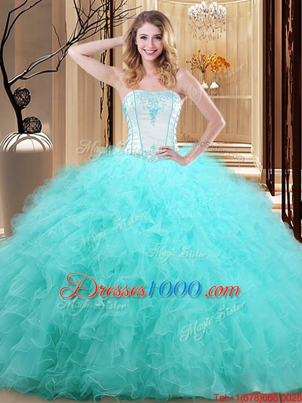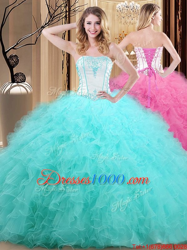 Blue Tulle Lace Up Strapless Sleeveless Floor Length Sweet 16 Dresses Embroidery