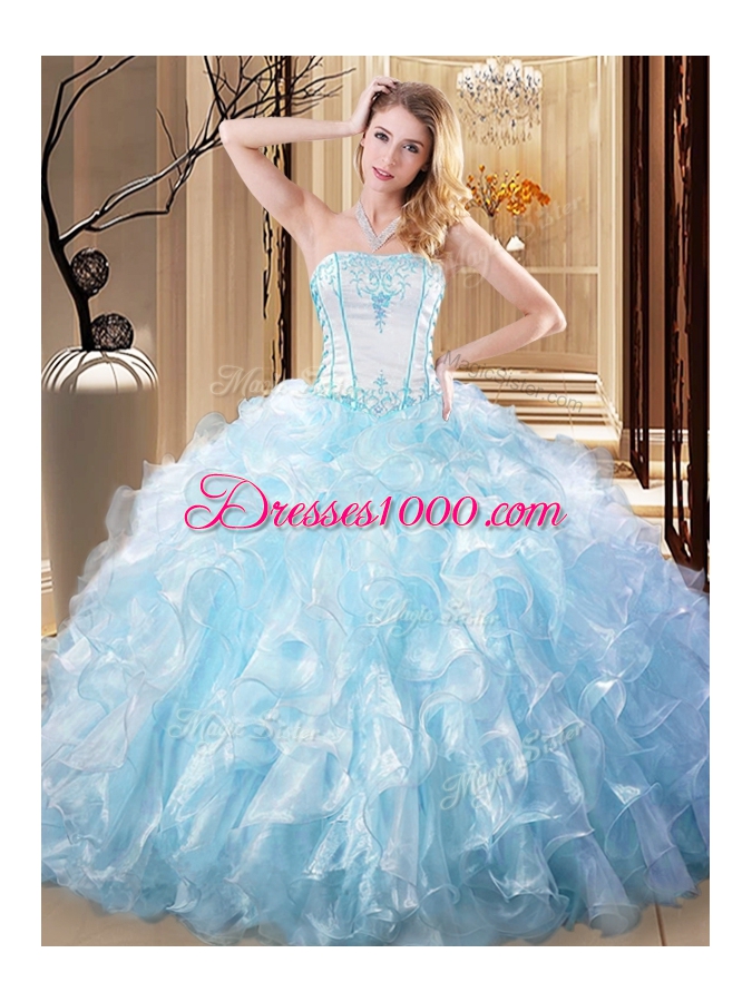 Graceful Light Blue Ball Gowns Strapless Sleeveless Organza Floor Length Lace Up Embroidery and Ruffles Sweet 16 Dress