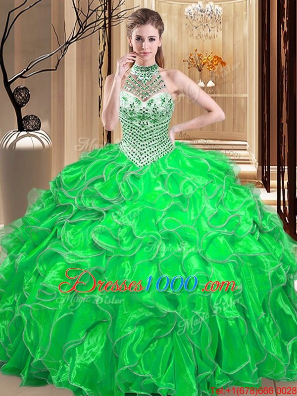 Ball Gowns Halter Top Sleeveless Organza Floor Length Lace Up Beading and Ruffles Quinceanera Gown